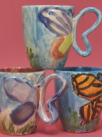 Learn how to make sculptures out of clay which will then be fired and glazed. Differnent techniques are taught, including slab building, pinching and coiling. The three mugs in the picture were designed by three young artists in December 2011.
